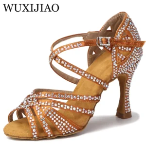 Latin dance shoes ladies new silk satin shiny rhinestone Cuban high heels 9 cm salsa dance shoes