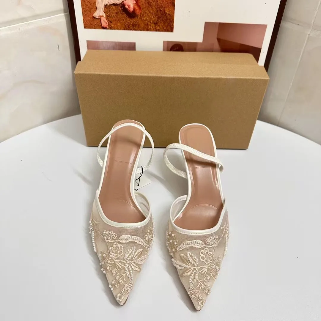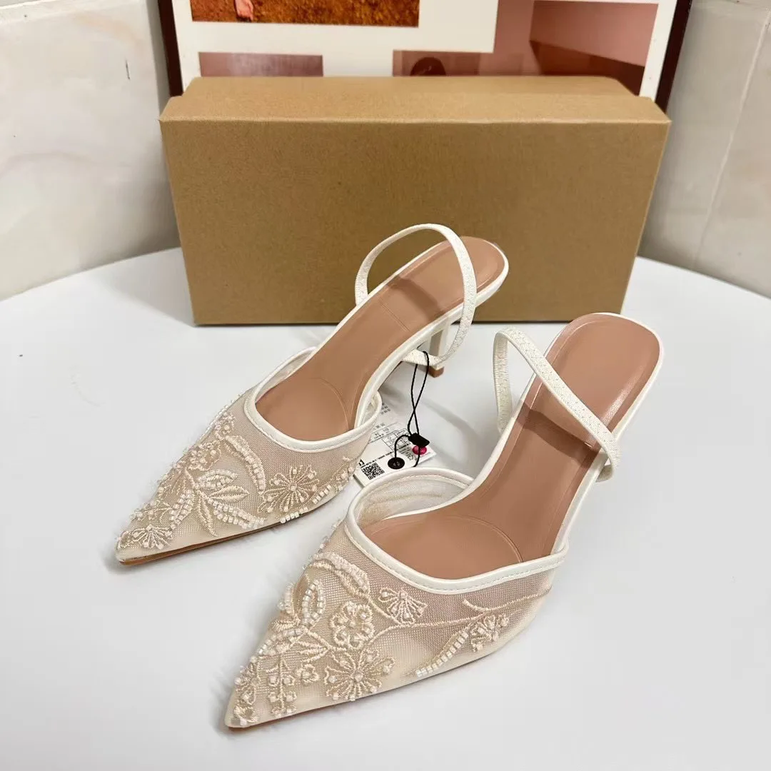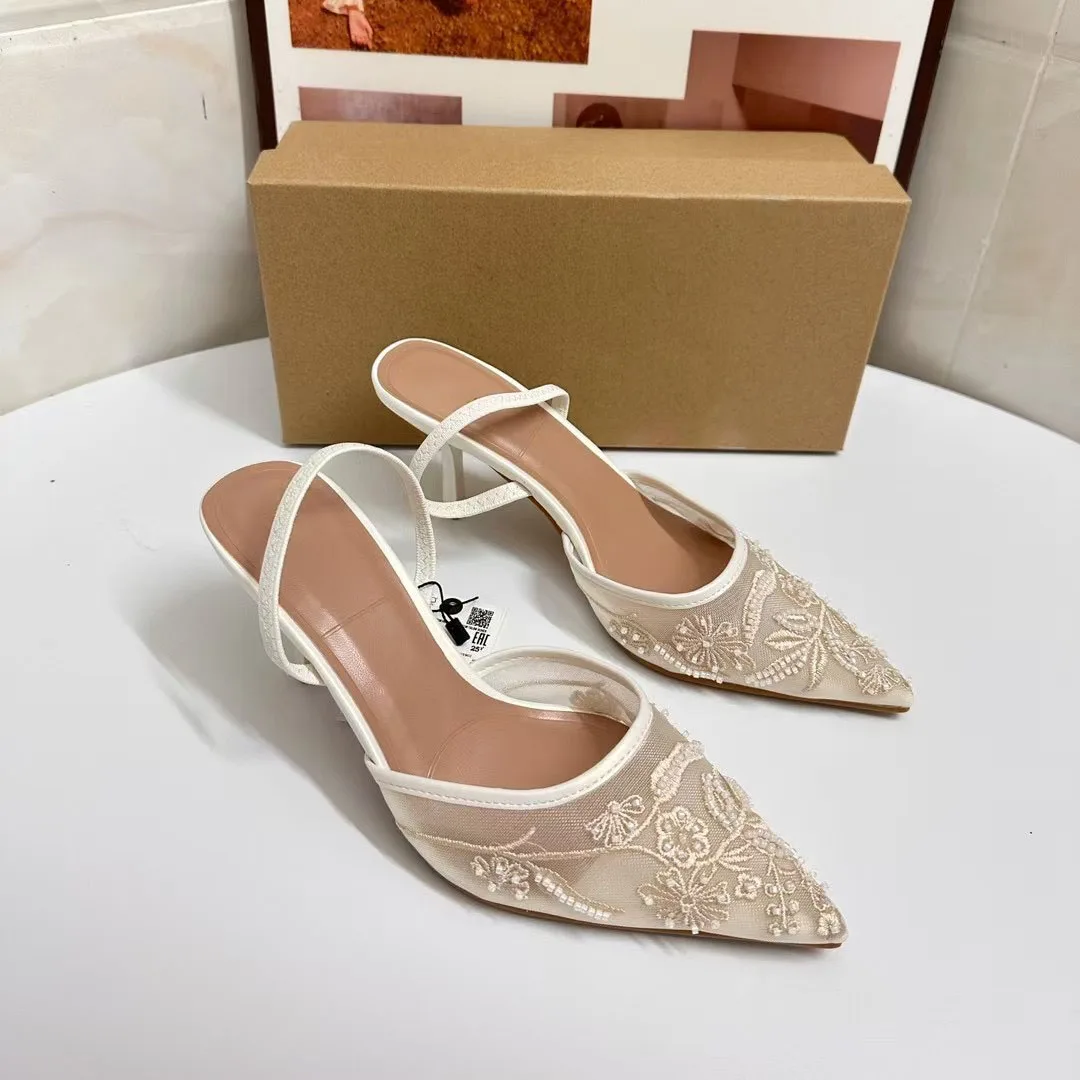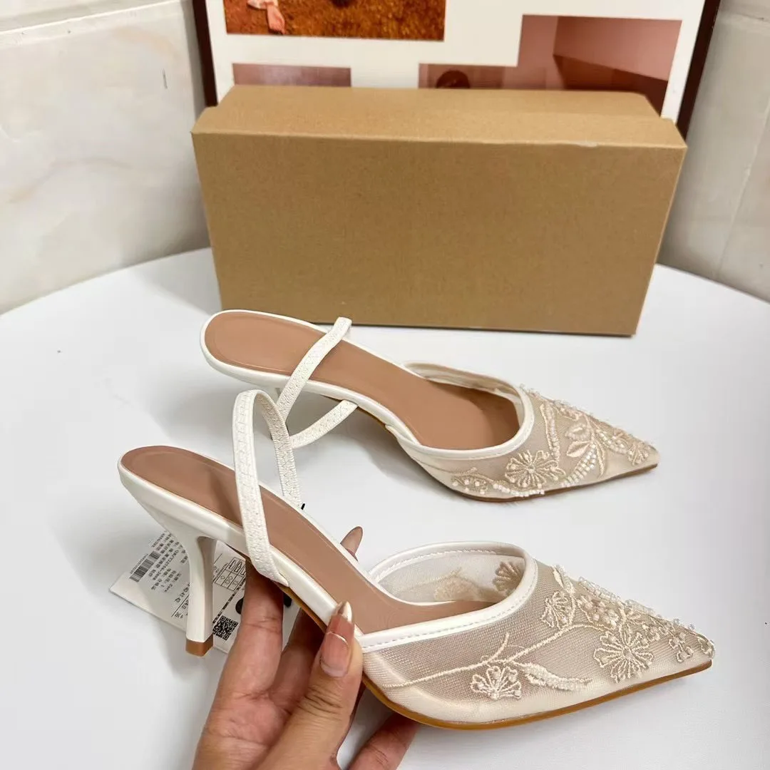 TRAF White Embroidery Mesh Stiletto Pumps New French Style Thin Heel Slingbacks For Woman Summer Point Head Sandal Women’s Shoes
